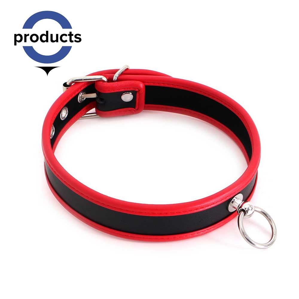 A PU leather black and red adjustable collar with a snap on O-Ring that can enhance your BDSM play.