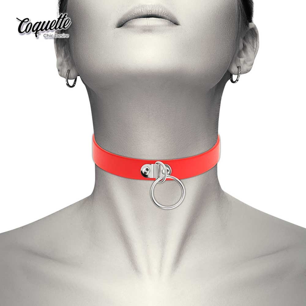 Get a daring look with this red handmade fetish choker and an O-ring by COQUETTE and prepare yourself for a special submissive experience.
